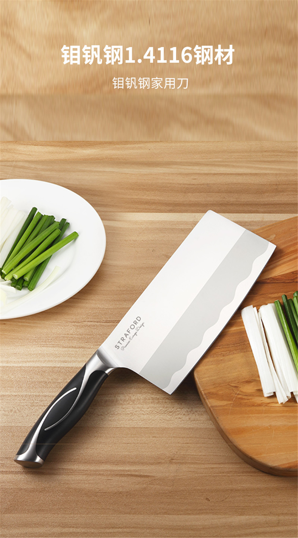 名称 钼钒钢家用中式菜刀材质 德国1.4116钼钒钢型号 F5净重 0.35kg(手工测量存在一定的误差)尺寸 30.5x8cm(手工测量存在一定的误差)硬度/刀背的厚度 菜刀的硬度是55度正负1度,刀背的厚度是2.3mm(手工测量存在一定的误差)刀刃的长度/厚度 18cm/0.7mm(手工测量存在一定的误差)温馨提示 新疆与西藏地区由于刀具和尖锐的商品管制严格,暂停发货,给您造成不便敬请原谅温馨提示 拼团商品非质量问题,不支持退换货注意事项 这款刀主要是用来切肉和切菜的,切勿砍骨头